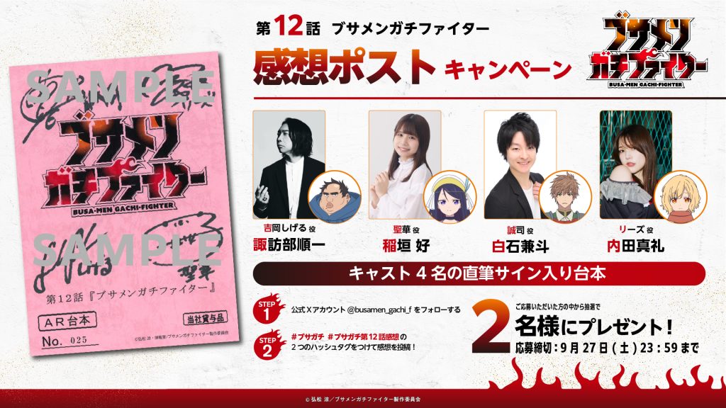 TVアニメ『ブサメンガチファイター』第12話放送を記念して、吉岡しげる役 諏訪部順一さん、聖華役 稲垣 好さん、誠司役 白石兼斗さん、リーズ役 内田真礼さんのサイン入り第12話台本を、2名様にプレゼント!